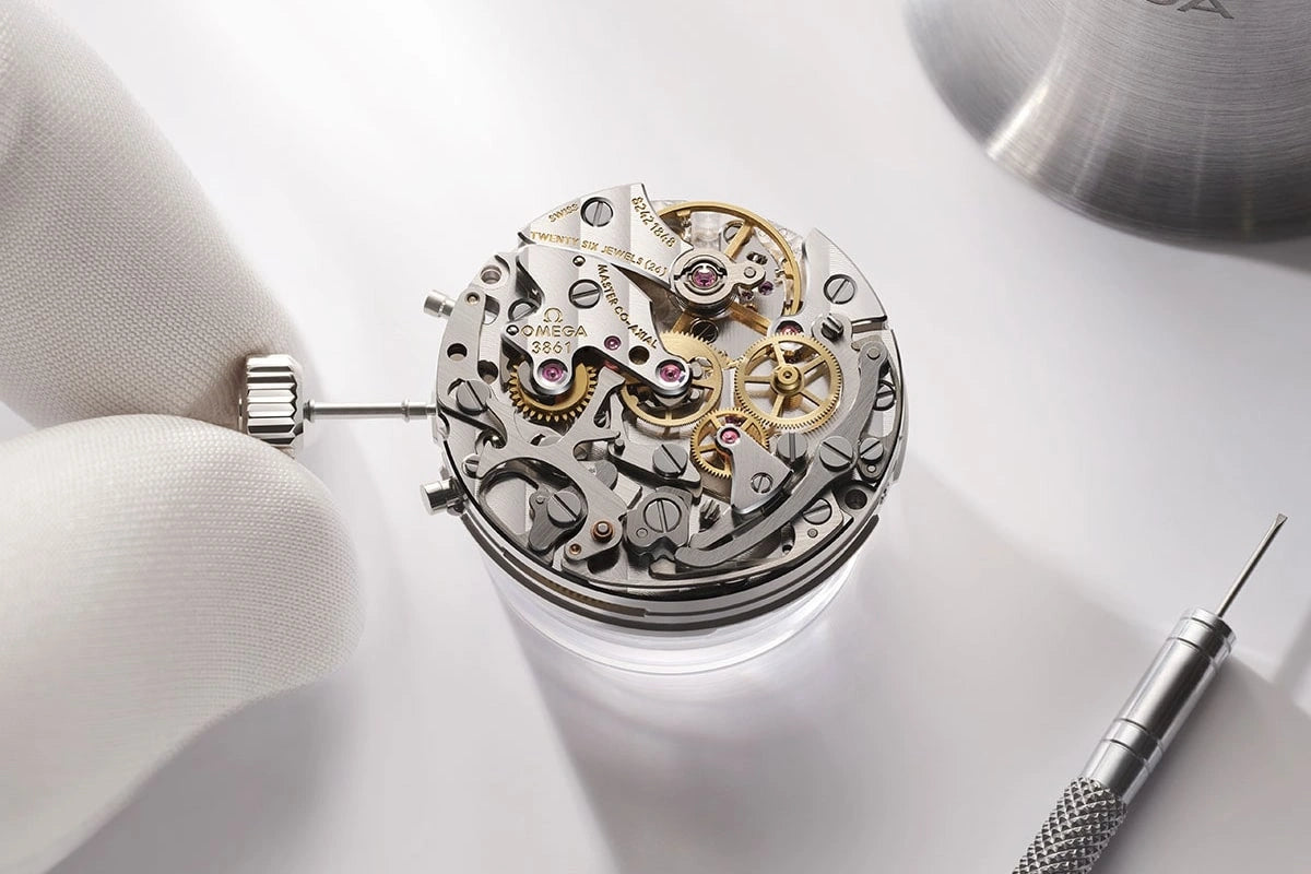 Such a timepiece is powered by a co-axial escapement, which has become an iconic and original OMEGA solution for the heart of the watch—the movement. The balance wheel also incorporates a silicon hairspring, a non-ferrous material that maintains its shape and resists sudden shocks. Other components, such as arbors and pinions, are made from the non-magnetic material Nivagauss.