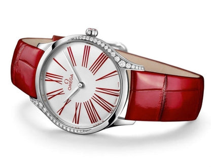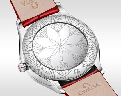 In 2017, Omega introduced the women's version of the De Ville Trésor, whose face was Kaia Gerber, daughter of Cindy Crawford. In this way, Omega clearly set an example of the importance of tradition and family. The watches of this special women's edition are available in case sizes of 36 and 38mm, decorated with two lines of diamonds around the circumference. The dial is complemented by distinctive Roman indexes and the crown also features one central diamond set in the surrounding red ceramic. The color options are red and blue, while lovers of classics can choose the black or nude version. The watch takes into account women's comfort and is available only in a battery-powered version with leather straps that can be changed. The back of the watch surprises with a discreet mirror.