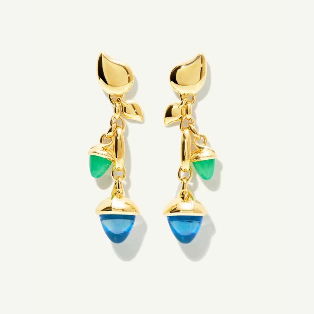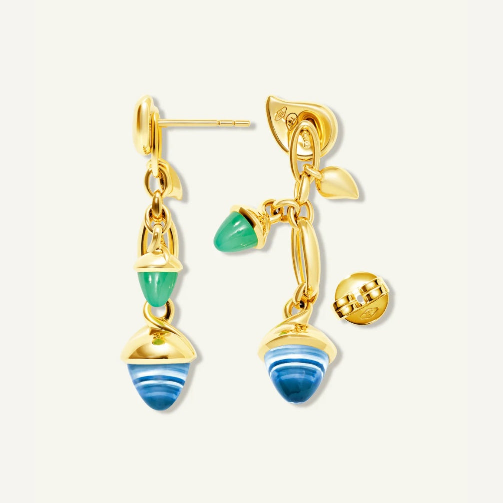 Pocta individualitě: Náušnice MIKADO Dangling 2 Acorn lze nosit jako elegantní visací náušnice, stylové náušnice do uší nebo jako přívěsek na řetízku. Jsou ručně vyrobeny z 18karátového zlata a charakteristické detaily ve tvaru kapek vody jim dodávají nezaměnitelný charakter. Osvěžující barevná kombinace „Lagoon“ spojuje zářivé modré a zelené tóny do vzhledu, který působí zářivě, tropicky a zároveň nenuceně elegantně.