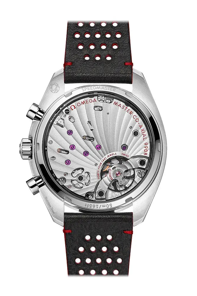 Kolekce Chronoscope vychází z legendárního designu hodinek Speedmaster. Kombinuje jej s inspirací náramkovými hodinkami OMEGA s chronografem ze 40. let 20. století. Tento 43mm model, vyrobený z ušlechtilé oceli, má stříbrný číselník s černými subčíselníky. Spolu s černě eloxovanou hliníkovou lunetou s tachymetrickou stupnicí mají ručičky tvar lístků a arabské číslice pokoveny rhodiem. Pod číslicemi se táhne jedinečný "spirálový" vzor. Číselník potištěný třemi výraznými časovými stupnicemi v designu "šneka" ze 40. let minulého století zobrazuje tachymetrickou, pulsometrickou a telemetrickou stupnici. Hodinky se prezentují černém koženém řemínku s červenými detaily, které dodávají hodinkám sportovní vzhled . Chronograf je vybaven malou černou sekundovkou na 9. hodině a 60ti minutovým a 12ti hodinovým sčítačem na 3. hodině. Hodinky pohání kalibr OMEGA Co-Axial Master Chronometer 9908.