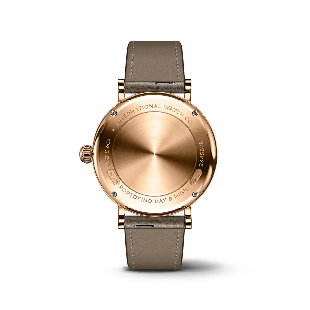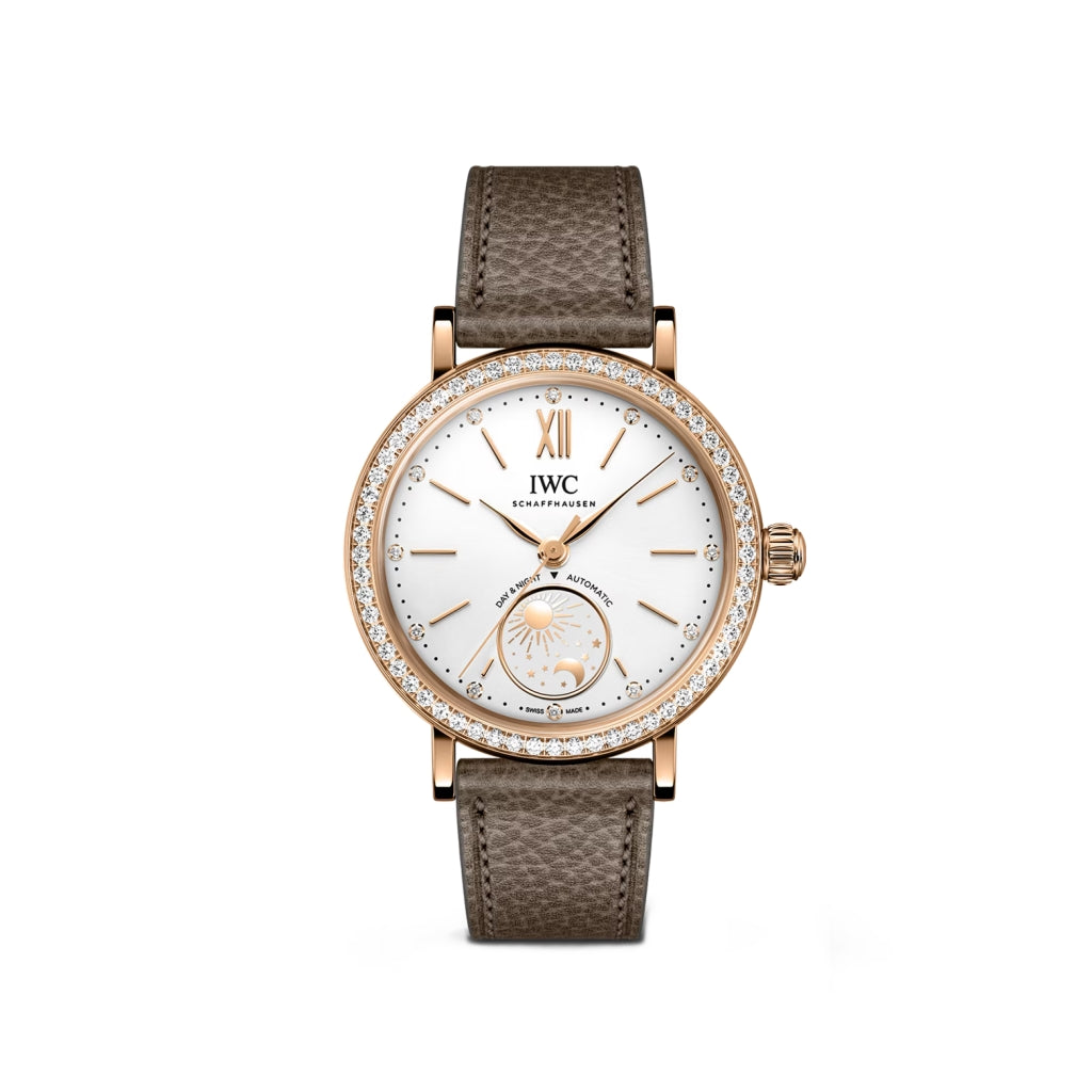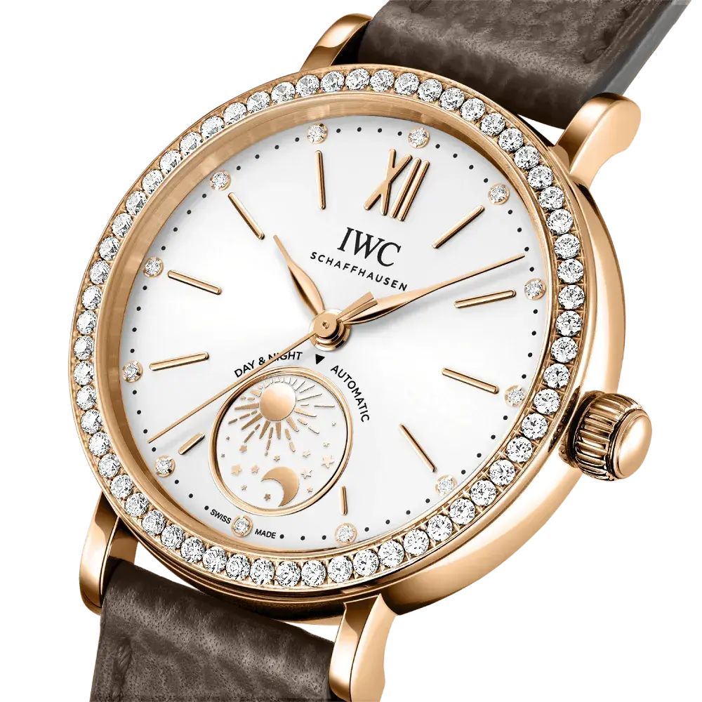 Bílý číselník s římskými číslicemi a jednoduchými hodinovými indexy doplňují štíhlé ručičky a ocelový náramek. Tento model má navíc lunetu osázenou diamanty a komplikaci ukazatele dne a noci. Za poslední tři desetiletí se řada hodinek Portofino etablovala jako jedna z nejúspěšnějších řad hodinek IWC Schaffhausen. Stálá poptávka po klasických modelech a puristickém designu u mužů i u žen předurčuje této kolekci neutuchající slávu a oblíbenost. Kolekce hodinek IWC Schaffhausen Portofino je inspirována uvolněným životním stylem středomořské riviéry, jejímž symbolem se stala malá italská rybářská vesnička Portofino. Tu v padesátých letech objevily ikony Hollywoodu jako Grace Kelly nebo Elizabeth Taylor. Hodinkám této řady sluší jednoduché křivky a snadno čitelný číselník. Kožený řemínek posouvá celkový dojem z hodinek o další krůček blíže naprosté dokonalosti. Navíc disponuje technologií quick-change, která umožňuje řemínek kdykoliv jednoduše vyměnit bez použití nářadí.