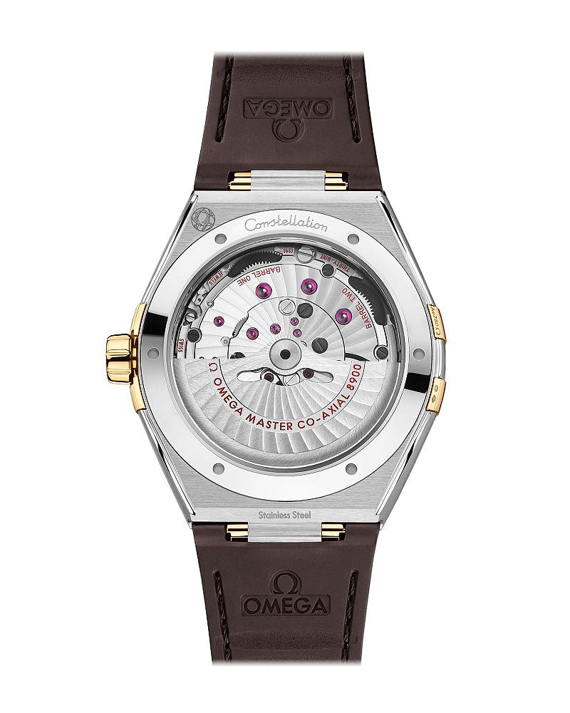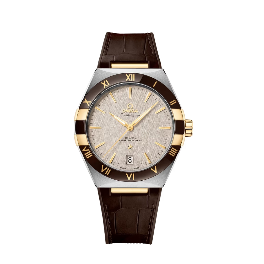 Dramatický a nestárnoucí design této kolekce hodinek charakterizují slavné půlměsícové fazety a "drápy" na pouzdře. Tento pánský 41mm model Omega Constellation z ušlechtilé oceli a 18karátového žlutého zlata má hnědou leštěnou keramickou lunetu s římskými číslicemi vyplněnými materiálem OMEGA Ceragold™. Má rhodiovaný šedý číselník s hedvábnou povrchovou úpravou a okénko s datumovkou na šesté hodině. Ručičky, logo OMEGA, hvězda Constellation a indexy se rovněž vyrábí z 18karátového žlutého zlata. Slavný jednořadý náramek nahradil hnědý kožený řemínek s gumovou podšívkou. Srdcem těchto hodinek je kalibr 8900 Co-Axial Master Chronometer značky OMEGA, který je viditelný přes safírové sklíčko odolné proti poškrábání.