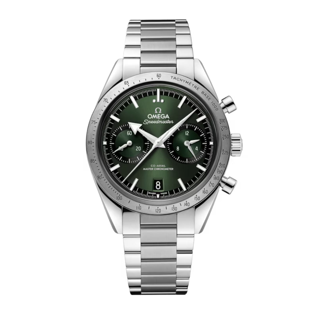 Hodinky Omega Speedmaster 57 jsou jedny z nejikoničtějších hodinek světa. Zúčastnily se všech šesti lunárních misí a jsou působivou reprezentací dobrodružného průkopnického ducha značky. Tento pánský model o průměru 40,5 mm, inspirovaný legendárním originálem z roku 1957, má pouzdro z ušlechtilé oceli a zelený číselník se zapuštěnými hodinovými indexy, na nichž se zobrazuje bílá Super-LumiNova. Vedle rhodiovaných ručiček "Broad Arrow" se na 6. hodině nachází datumovka. Na 9. hodině malý sekundový subčíselník a na 3. hodině 12hodinový a 60minutový chronograf.