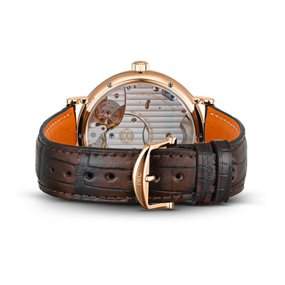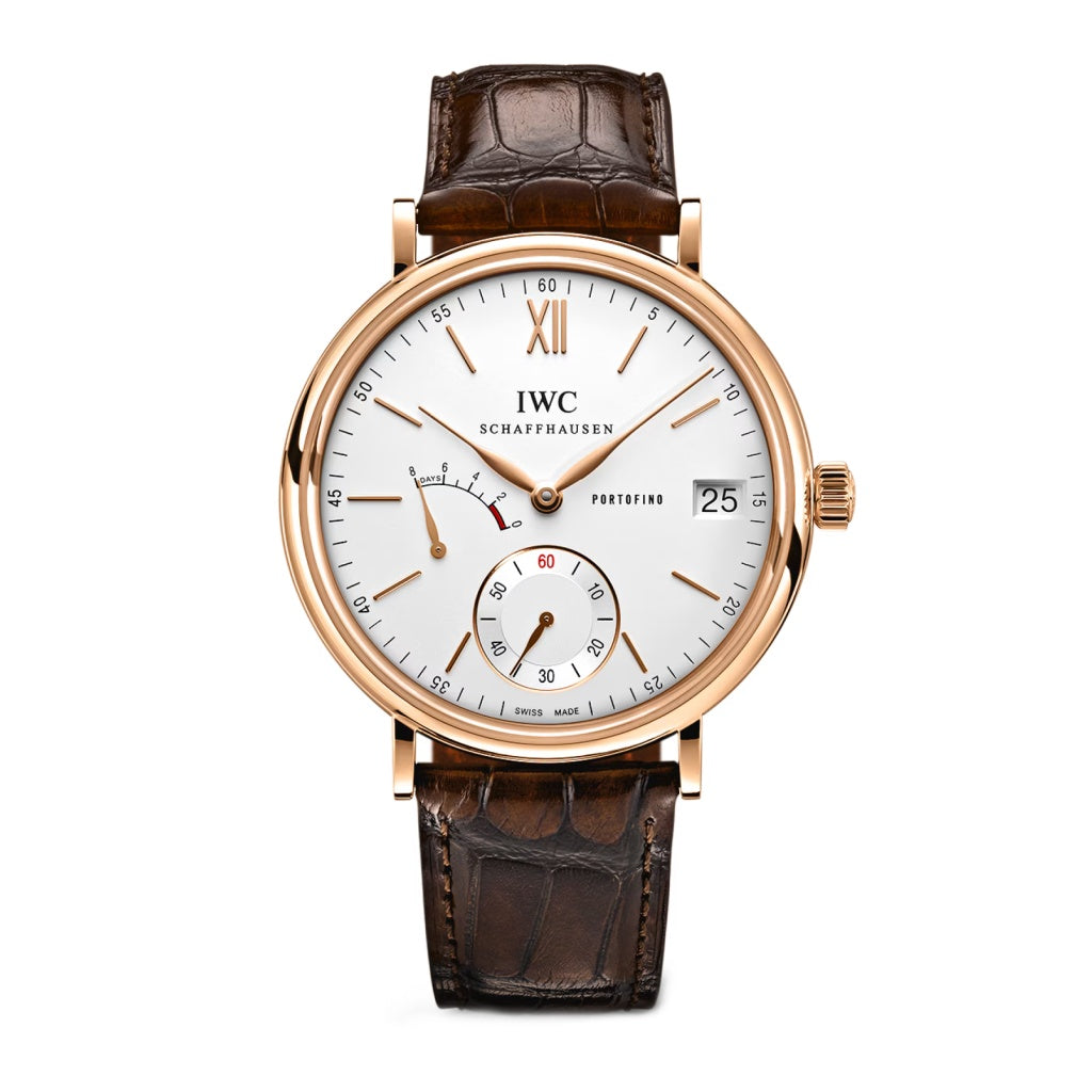 V hodinkách Portofino Hand-Wound Eight Days bude strojek kalibru 59210 vyrobený společností IWC Schaffhausen pracovat přesně a spolehlivě po celých 192 hodin, tedy 8 dní, než se automaticky zastaví. Přísně vzato je to 9 dní, ale den navíc v rezervě zajišťuje, že si strojek udržuje co nejstálejší hnací moment a pokračuje v přesném chodu. Majitel bude vždy na bezpečné straně, pokud bude hodinky natahovat jednou týdně. Zbývající výkon lze odečíst na ukazateli rezervy chodu na ciferníku. Spolu s ukazatelem malých vteřin a ukazatelem data dodává ciferníku příjemnou vyváženost. Rovnováha bez indexu má frekvenci 28 800 úderů za hodinu a spolu s pružinou Breguet ohnutou do tvaru v souladu s letitou hodinářskou tradicí přispívá k mimořádné přesnosti hodinek. Hodinky jsou k dispozici s pouzdrem z 18karátového zlata 5N, postříbřeným číselníkem a indexy z ryzího zlata. Mají průhledné safírové zadní sklo a tmavě hnědý řemínek z aligátoří kůže od domu Santoni.