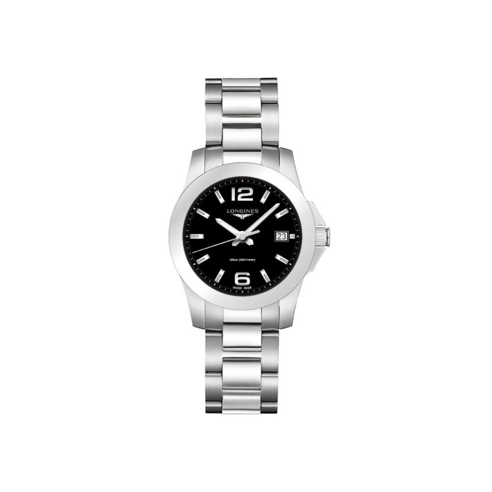Dámské hodinky Longines Conquest kombinují elegantní vzhled s vysokou funkčností. Jsou vybaveny ocelovým náramkem zakončeným motýlkovou sponou, který zajišťuje pohodlné nošení. Pouzdro z ušlechtilé oceli o průměru 34 mm má jemně broušený povrch a je doplněno šroubovací korunkou pro lepší ochranu.