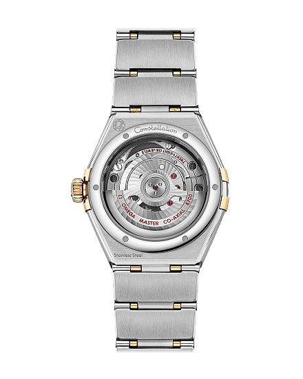 Dramatický a přetrvávající design hodinek OMEGA Constellation charakterizují slavné půlměsícové okraje a "drápky" na pouzdře a jednořadý náramek. Tento 29mm model z 18karátového žlutého zlata a ušlechtilé oceli má lunetu s vyrytými římskými číslicemi, křišťálově bílý slídový ciferník s diamantovými hodinovými značkami a datumovým okénkem na pozici 6 hodin. Ručičky, logo OMEGA, hvězda Constellation jsou rovněž z 18karátového žlutého zlata. Srdcem těchto hodinek je kalibr OMEGA Co-Axial Master Chronometer 8700, který je viditelný skrze klenuté safírové sklíčko odolné proti poškrábání.