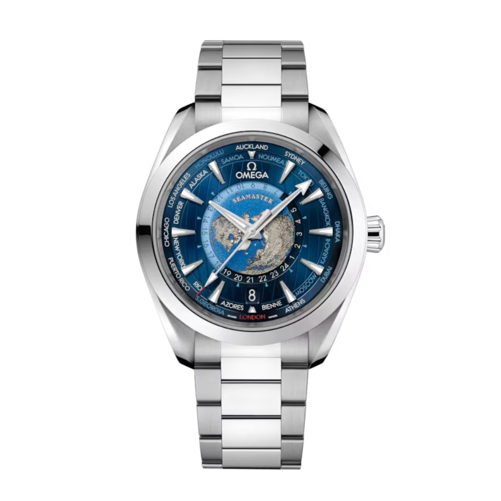 Tento model Omega Seamaster Worldtimer o průměru 43 mm má leštěné pouzdro z ušlechtilé oceli, které se napájí na ocelový tah. Vnější část číselníku je slunečně modrá a obsahuje svislé teakové pruhy. Kruh světových destinací má barvu červenou (GMT), stříbrnou ( 1h v létě) a modrou (místa bez letního času). Střed číselníku obsahuje 24hodinový skleněný prstenec, přičemž světle modrá barva označuje den a tmavě modrá noc. Vize Země je vytvořena na titanové destičce třídy 5. Ta byla laserem upravena tak, aby vytvořila modrý oceán a zanechala reliéf kontinentů. Kontrastní barvy zemského povrchu jsou přirozeně získány chemickou reakcí laseru.