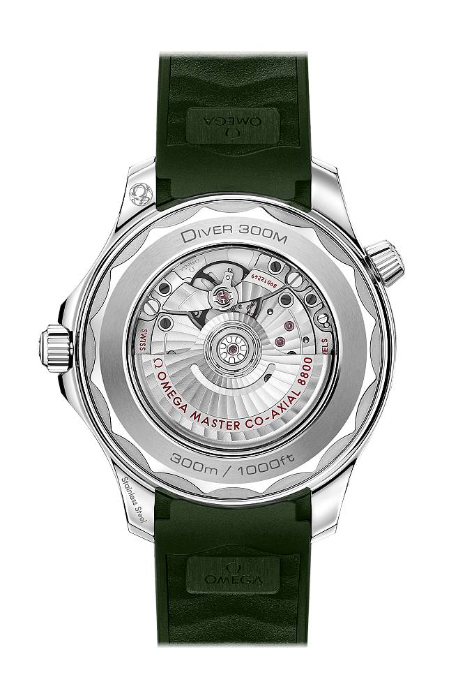 Hodinky Seamaster Professional Diver 300M se od roku 1993 těší legendární oblibě. Dnešní moderní kolekce převzala toto slavné oceánské dědictví a doplnila ho o nejlepší inovace a design značky OMEGA. Zaujímají jak výrazně zpracovaným pouzdrem, tak jejich komplikovanějším osmi článkovým tahem. Dále jim dominují již klasické, laserem vyryté vlnky v číselníku, který je umístěný v pouzdru o velikosti 42 mm. Hodinky jsou určené bezesporu k potápění. Pyšní se héliovým ventilem, šroubovací korunkou a 300 m vodotěsností. Keramická otočná luneta, luminiscence kulatých indexů a skeletovaných ruček z nich dělá skvělého a odolného parťáka na veškeré vodní a jiné sportovní aktivity. Tento 42 mm model vyrobený z nerezové oceli nese zelenou keramickou lunetu s potápěčskou stupnicí. Bondovky se prezentují na nastavitelném náramku z ušlechtilé oceli s přídavným potápěčským prodloužením . Pohání je kalibr OMEGA Master Chronometer 8800.