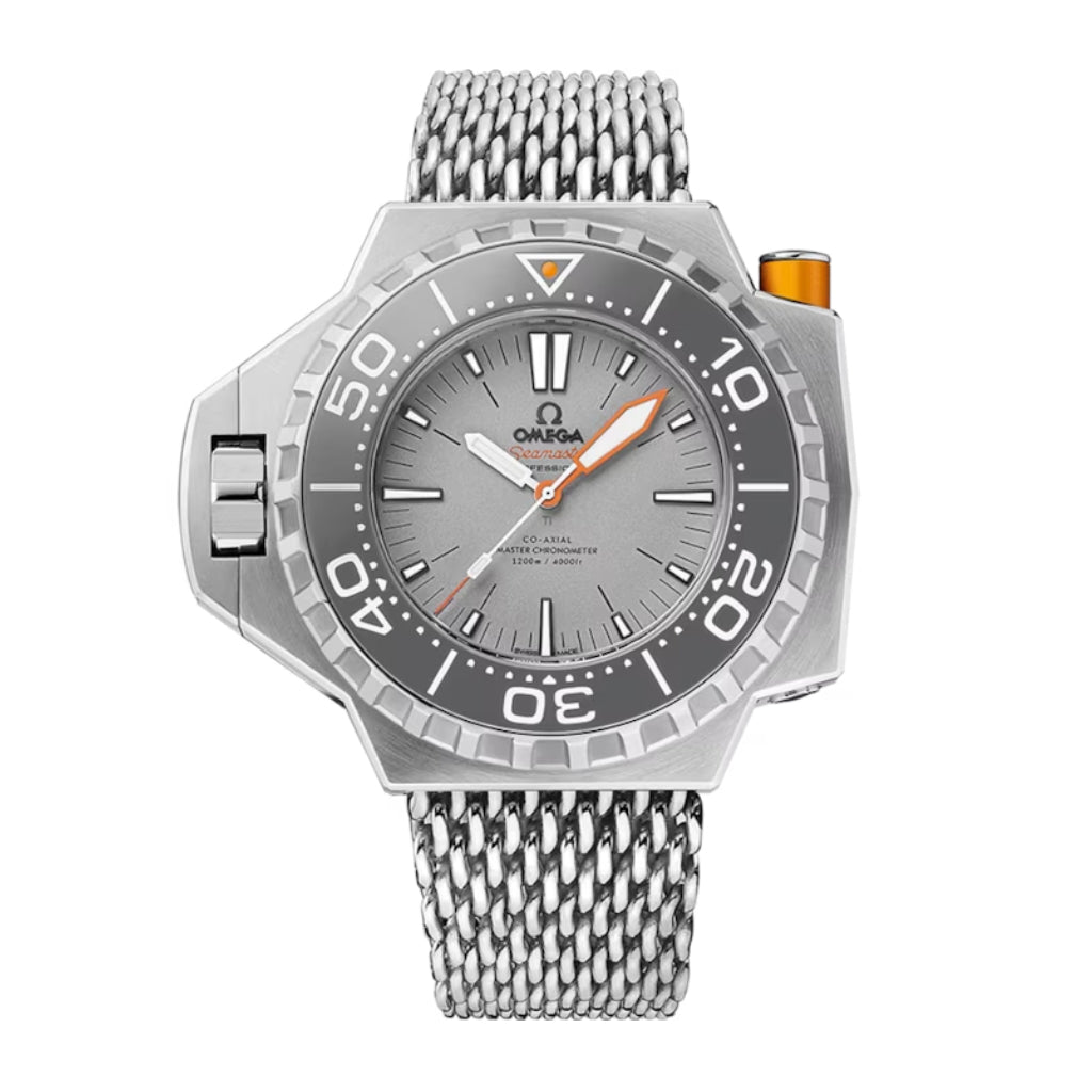 Slavné hodinky Ploprof, které jsou spolehlivé i v hloubce 4000 stop pod mořskou hladinou. Nesou tak jméno jako jedny z nejspolehlivějších potápěčských hodinek značky OMEGA. Tato nová edice si zachovává původní robustní a odvážný vzhled. Je ovšem doplněná kalibrem OMEGA Co-Axial Master Chronometer Calibre 8912, který je vybavený revoluční technologií jako je proslulá antimagnetická odolnost, chronometrický výkon a přesnost. Součástí jedinečného pouzdra je šedá otočná luneta z dusíku křemičitého, jehož číslice, trojúhelník a stupnice jsou pro lepší viditelnost vyplněny vrstvou Super-LumiNova. Jako materiál pouzdra a přezky byl použitý titan třídy 5, který zajišťuje nízkou hmotnost. Vzhled číselníku doplňuje oranžový hliník a lakované bílé ručičky. Leštěný náramek z titanu třídy 2 "odolný proti žralokům" ještě více umocňuje výrazný pocit dobrodružství. Hodinky jsou dodávané ve speciální prezentační krabičce spolu s přídavným šedým gumovým řemínkem. Kovový styl těchto hodinek dodává sílu myšlence objevovat oceány.