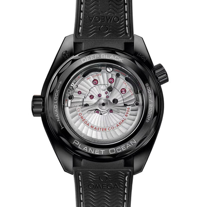 Mezi další prvky patří alveolový vzor na šroubovacím zadním krytu a černý pryžový řemínek s kontrastním prošíváním a antibakteriální úpravou podšívky. Hodinky Planet Ocean „Deep Black“ jsou vodotěsné do 60 barů a pohání je kalibr OMEGA Master Chronometer 8906. Aby získal status Master Chronometer, prošel 8 přísnými testy stanovenými METAS (Švýcarský federální institut metrologie).