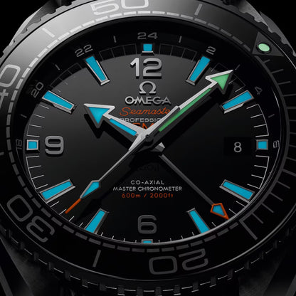 OMEGA zkoumá temnou stranu oceánu a využívá své zkušenosti s keramikou k výrobě hodinek Seamaster Planet Ocean „Deep Black“. Tyto pozoruhodné hodinky o průměru 45,5 mm jsou kombinací modelu GMT a potápěčských hodinek. Jsou zbarveny zcela do černa, aby představovaly oceán v hloubce 300 m. Lesklé a kartáčované pouzdro bylo vyrobeno z jediného bloku keramiky, stejného materiálu, který byl použit na jednosměrný rámeček a číselník s arabskými číslicemi.
