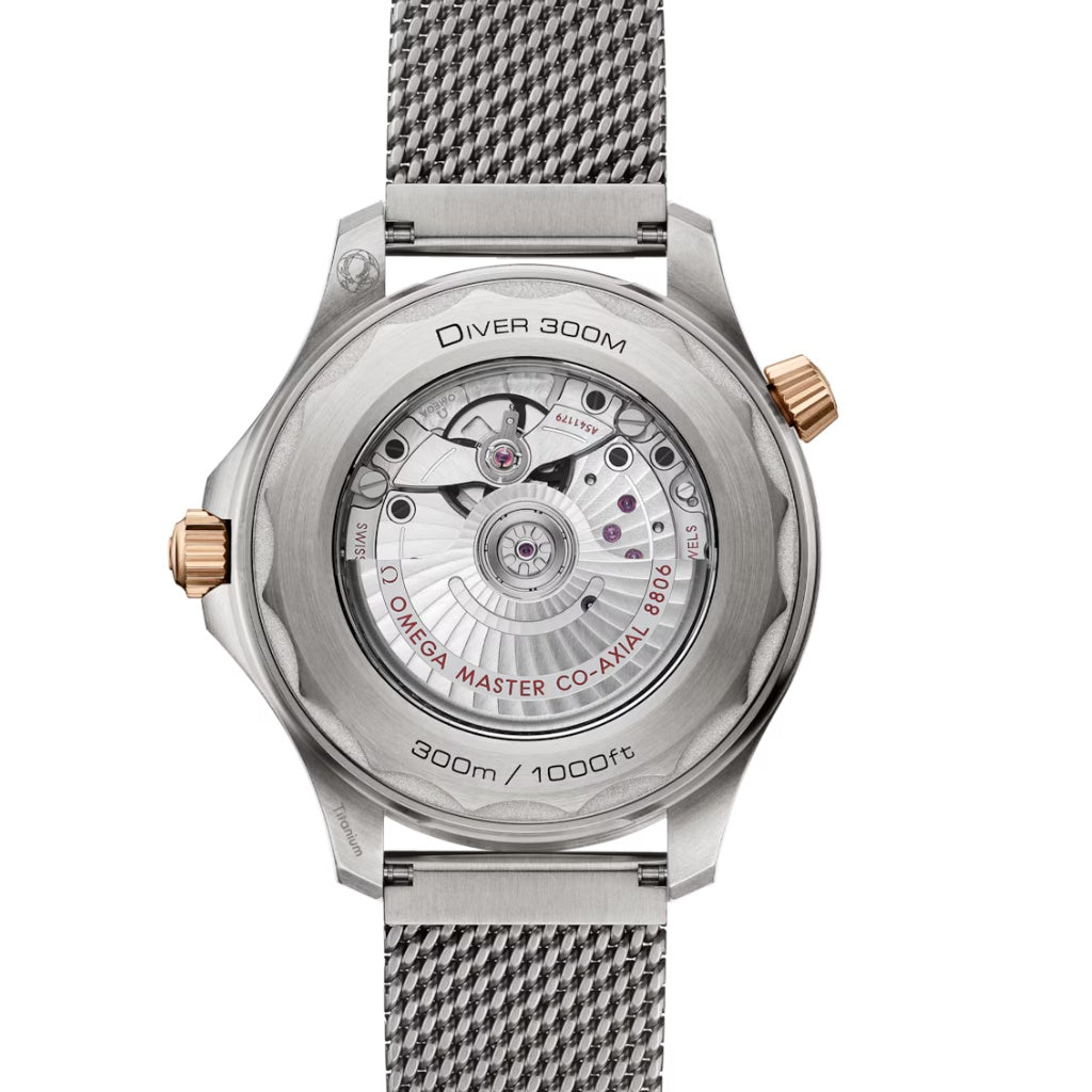 Hodinky jsou prezentovány na broušeném síťovaném náramku se zapínáním a pohání je kalibr OMEGA Co-Axial Master Chronometer 8806, který lze pozorovat přes safírové sklíčko a vlnkově lemovanou zadní stranu pouzdra.