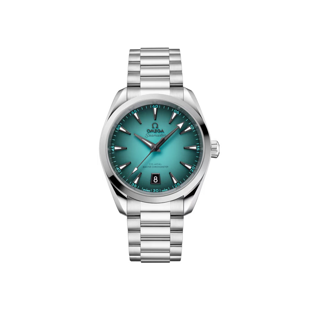 Lakovaný tyrkysový číselník je zvýrazněn černým gradientním efektem a je opatřen fasetovanými ručičkami a hodinovými značkami s šedou PVD úpravou a bílou Super-Luminovou. Logo OMEGA a okénko s datem mají rovněž šedou PVD úpravu, která ladí s přenesenými nápisy v šedé a tyrkysové barvě.