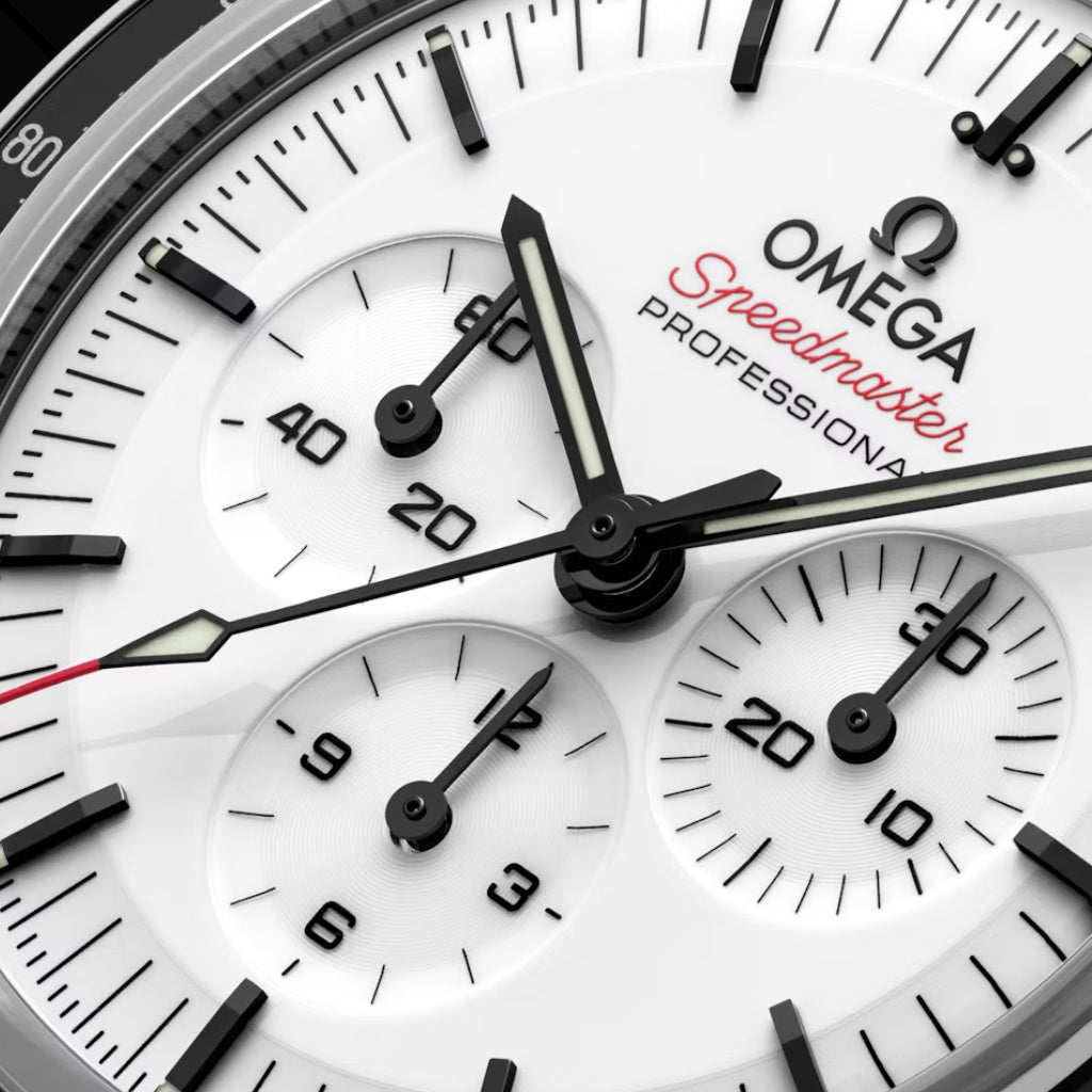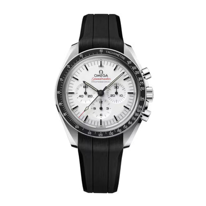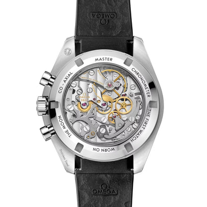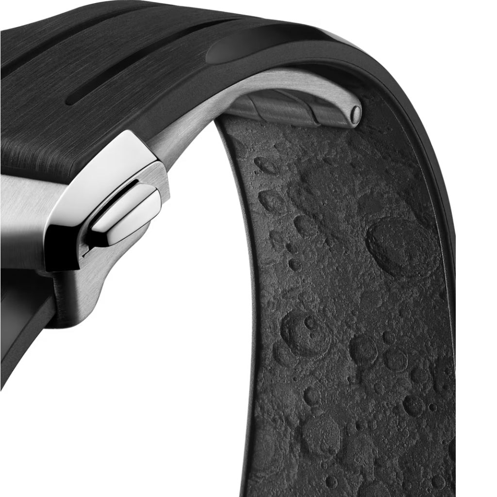 Hodinky jsou prezentovány na integrovaném černém pryžovém řemínku s pozitivním reliéfním vzorem měsíčního povrchu na jeho spodní straně. Slavný kalibr OMEGA Co-Axial Master Chronometer 3861 pohání malý sekundový subciferník, 30minutový a 12hodinový záznamník spolu s centrální funkcí chronografu.