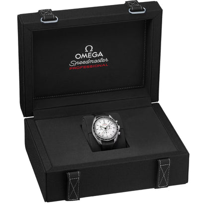 Tyto 42mm hodinky Moonwatch z ušlechtilé oceli mají safírové sklo na přední straně i na zadní straně pouzdra. Hodinky jsou inspirovány stylem hodinek Speedmaster 4. generace, které se nosily na Měsíci, a zahrnují také asymetrické pouzdro, bíle lakovaný stupňovitý číselník s aplikovaným logem OMEGA a indexy, ručičky ve stylu Moonwatch a slavnou tečku nad 90 na černě eloxovaném hliníkovém kroužku rámečku.