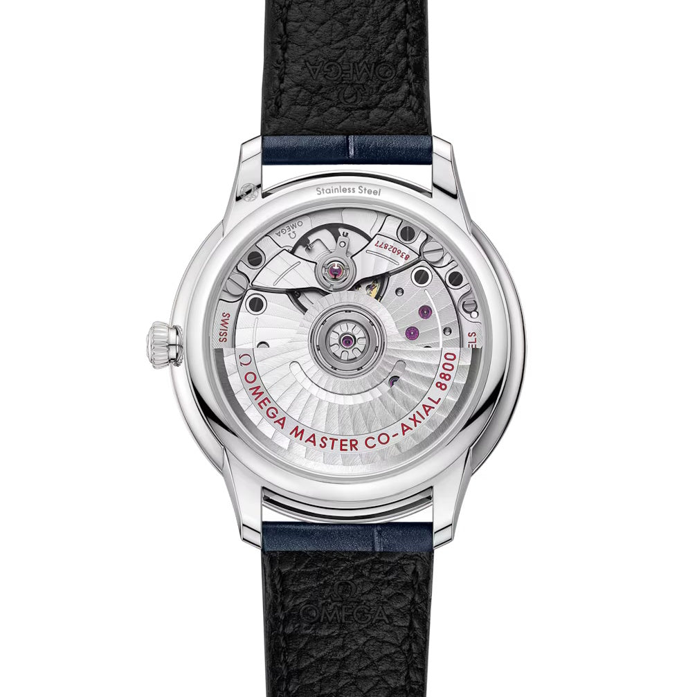 Tyto hodinky s certifikátem Master Chronometer jsou dodávány s lesklým tmavě modrým koženým řemínkem a jsou poháněny kalibrem OMEGA Master Co-Axial 8800, který lze obdivovat přes zadní kryt z odolného safírového skla.
