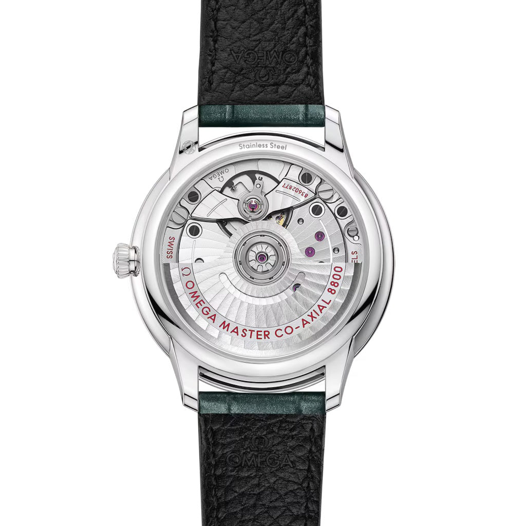 Tyto hodinky s certifikací Master Chronometer jsou prezentovány na třpytivém borovicově zeleném koženém řemínku a pohání je kalibr OMEGA Master Co-Axial 8800, který lze obdivovat přes zadní safírové sklo odolné proti poškrábání.