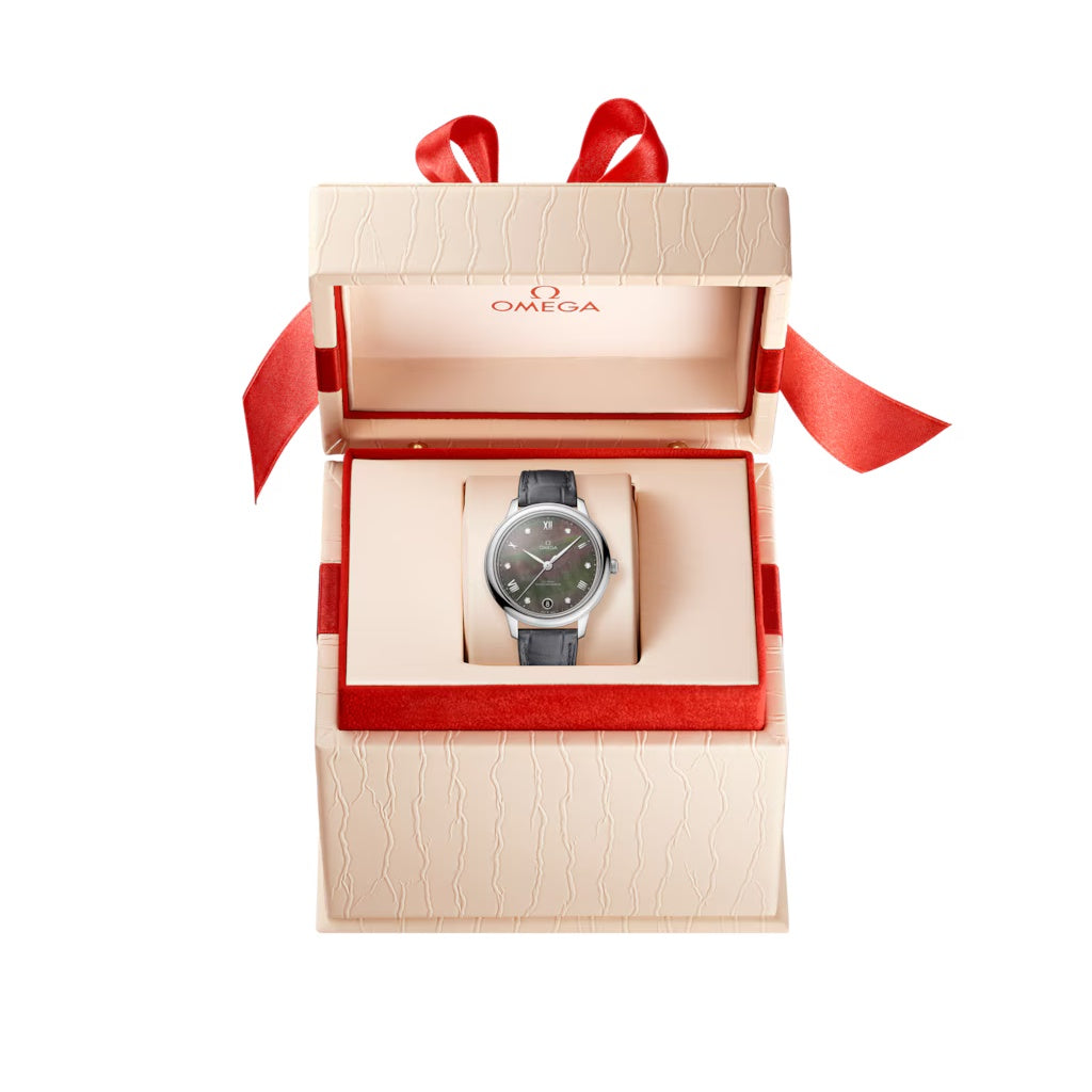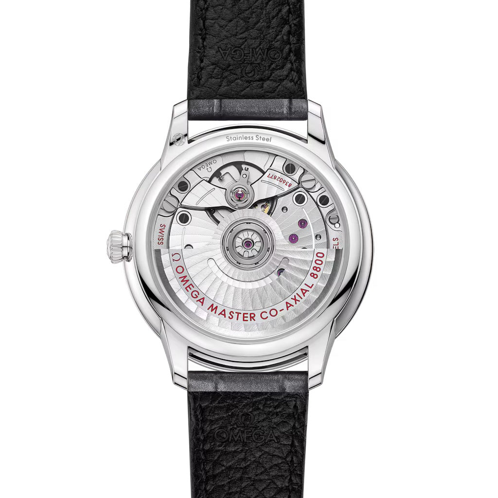 Tyto hodinky s certifikací Master Chronometer jsou prezentovány na třpytivém tmavě šedém koženém řemínku a pohání je kalibr OMEGA Master Co-Axial 8800, který lze obdivovat přes zadní safírové sklo odolné proti poškrábání.