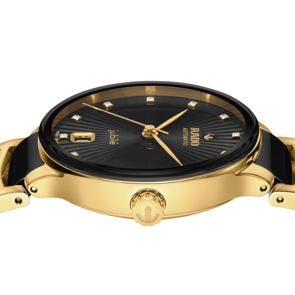 Zažijte harmonické spojení vizuální harmonie a uměleckého vyjádření s hodinkami Rado Centrix Automatic Diamonds. Jemně zakřivené safírové sklo se zaoblenými hranami, spojené s pouzdrem, dotváří design a zajišťuje perfektní čitelnost díky antireflexní vrstvě na obou stranách. Uvnitř se nachází tříručkový kalibr R763, který díky antimagnetické spirále Nivachron™ pro vyšší spolehlivost a přesnost překračuje standardní požadavky na přesnost v 3 až 5 polohách. Celkový vzhled těchto ikonických hodinek dotvářejí upravené úchyty pouzdra a náramek z nerezové oceli potažené PVD vrstvou v barvě žlutého zlata s černými high-tech keramickými středovými články. Černý fazetovaný ciferník s 12 diamanty má opulentní 3D efekt, který vznikl lisováním tvarovaného ciferníku a jeho následným vyplněním lakem. Hodinky jsou vodotěsné do 50 m a nabízejí 80 hodin rezervy chodu.