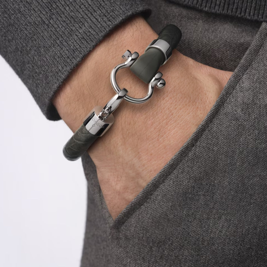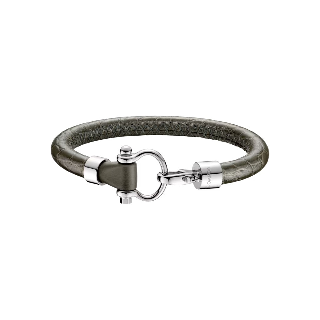 Náramek Sailing z ušlechtilé oceli a zelené aligátoří kůže. Námořnické náramky společnosti OMEGA jsou neformální, barevné a snadno se nosí. Kolekce doplňků OMEGA je pevně propojena s kolekcemi hodinek. Jedná se o kreativní kousky, které kombinují různé druhy materiálů a povrchové úpravy hodinek.